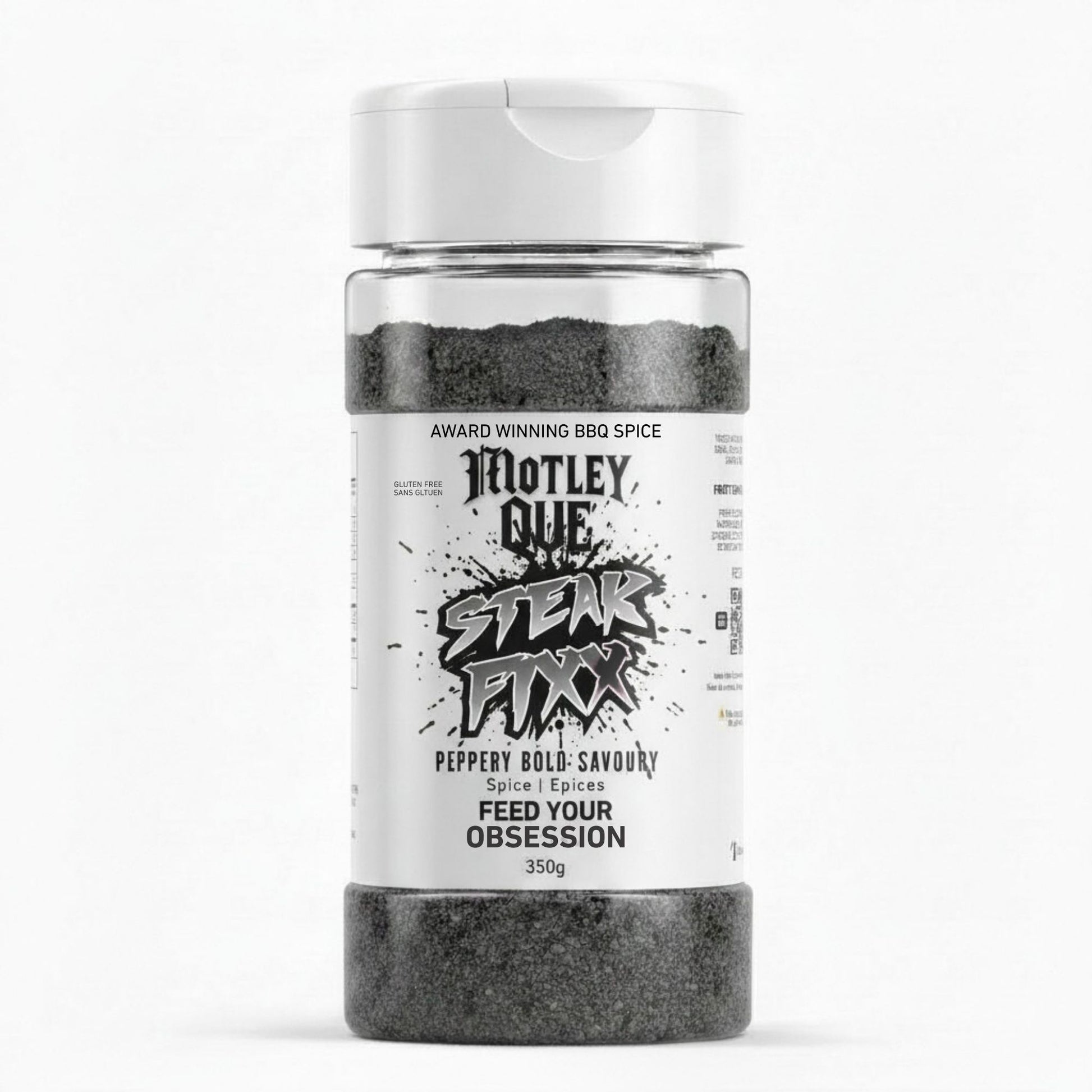 Crank up the heat and let Motley Que’s Steak Fixx take center stage! This high-voltage steak rub is packed with audacious aromatics, deep umami, and a bold hit of activated charcoal for a flavor-packed crust and a show-stopping look.